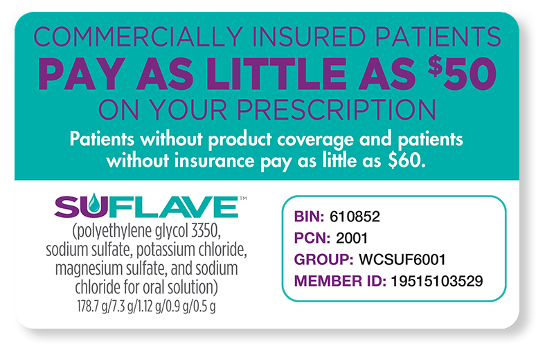 SUFLAVE® (polyethylene glycol 3350, sodium sulfate, potassium chloride, magnesium sulfate, and sodium chloride for oral solution) is an osmotic laxative indicated for cleansing of the colon in preparation for colonoscopy in adults.