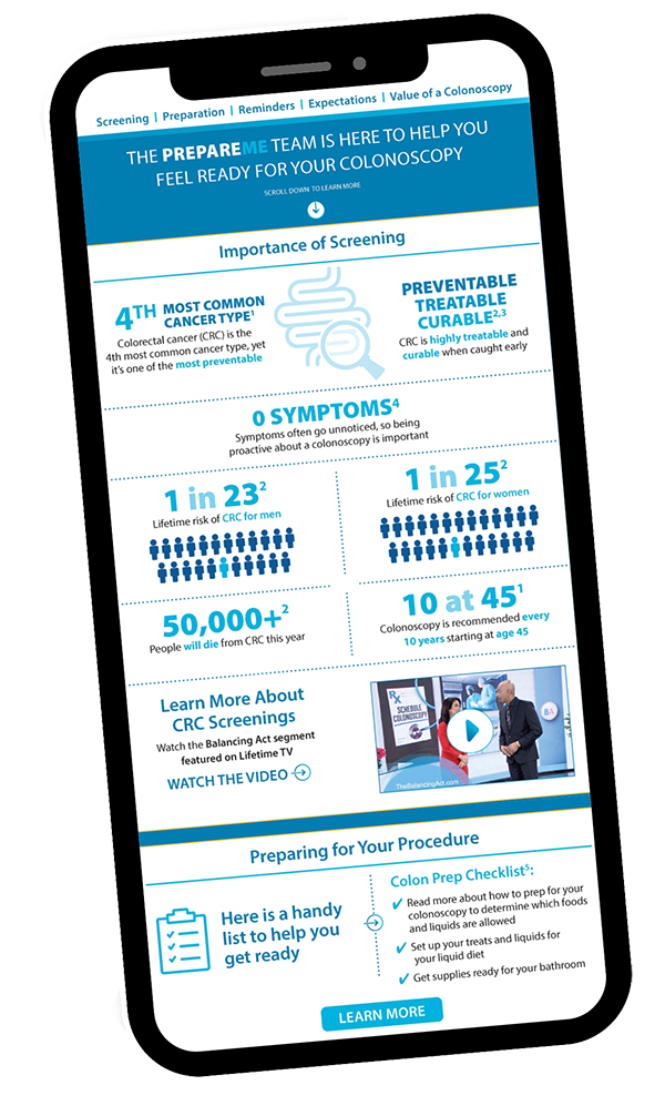 References: 1. Rex DK, Anderson JC, Butterfly LF, et al. Quality indicators for colonoscopy. Gastrointest Endosc. 2024;100(3):352-381. doi:10.1016/j.gie.2024.04.2905 2. Johnson DA, Barkun AN, Cohen LB, et al. Optimizing bowel preparation quality for colonoscopy: consensus recommendations by the US Multi-Society Task Force on Colorectal Cancer. Am J Gastroenterol. 2025;00:1-27. doi.org/10.14309/ajg.0000000000003287 3. SUFLAVE® [package insert]. Braintree, MA: Braintree Laboratories, Inc. 4. Bhandari R, Goldstein M, Mishkin DS, et al. Comparison of a novel, flavor-optimized, polyethylene glycol and sulfate bowel preparation with oral sulfate solution in adults undergoing colonoscopy. J Clin Gastroenterol. 2023;57(9):920-927. doi:10.1097/MCG.0000000000001894 5. SUTAB® [package insert]. Braintree, MA: Braintree Laboratories, Inc. 6. Di Palma JA, Bhandari R, Cleveland M, et al. A safety and efficacy comparison of a new sulfate-based tablet bowel preparation versus a PEG and ascorbate comparator in adult subjects undergoing colonoscopy. Am J Gastroenterol. 2021;116(2):319-328. doi:10.14309/ajg.0000000000001020 7. Vemulapalli KC, Lahr RE, Rex DK. 2021 patient perceptions regarding colonoscopy experience. J Clin Gastroenterol. 2023;57(4):400-403. doi:10.1097/MCG.0000000000001689 8. Calderwood MS, Rex DK, Halberg, et al. S488 Bowel preparation hesitancy identified as biggest barrier to screening colonoscopy: results from a large online survey of patients who complete colonoscopy. Am J Gastroenterol. 2024;119(10S): S341-S342. doi:10.14309/01.ajg.0001031320.73104.3b 9. Elwyn G, Frosch D, Thomson R, et al. Shared decision making: a model for clinical practice. J Gen Intern Med. 2012;27:1361-1367. Accessed March 24, 2025. https://doi.org/10.1007/s11606-012-2077-6 10. Agency for Healthcare Research and Quality. The CAHPS Ambulatory Care Improvement Guide: Strategy 6I: Shared Decision Making. Rockville, MD (2017). Accessed March 24, 2025. https://www.ahrq.gov/sites/default/files/wysiwyg/cahps/quality-improvement/improvement-guide/6-strategies-for-improving/communication/cahps-strategy-section-6-i.pdf 11. Rex DK, Anderson JC, Butterfly LF, et al. Quality indicators for colonoscopy. Gastrointest Endosc. 2024;100(3):352-381. doi:10.1016/j.gie.2024.04.2905 12. Wiener G, Winkle P, McGowan JD, et al. A phase 2 evaluation of a new flavored PEG and sulfate solution compared to an over-the-counter laxative, PEG and sports drink bowel preparation combination. BMC Gastroenterol. 2023;23:433. doi:10.1186/s12876-023-03069-8 13. Walker ML, Cleveland MV, Hague KM, et al. A formulation development study of BLI4900, a novel flavor enhanced bowel preparation for colonoscopy. Gastro Endoscopy. 2022;95(6, suppl). Available at https://doi.org/10.1016/j.gie.2022.04.188. Accessed Nov 11, 2024. 14. Solonowicz O, Stier M, Kim K, et al. Digital navigation improves no-show rates and bowel preparation quality for patients undergoing colonoscopy: a randomized controlled quality improvement study. J Clin Gastroenterol. 2022;56(2):166-172. doi:10.1097/MCG.